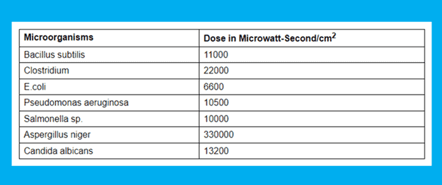 The amount of energy or UV dose a microbe absorbs directly affects how well it can be disinfected. UV disinfection uses the first order kinetic reaction. The amount of ultraviolet light that is applied directly relates to the microbiological kill rate. The kill rate will increase with increasing dose. It is advised to use a UV tube for no more than 6000 burning hours because the UV tube’s ultraviolet beam intensity reduces over time.